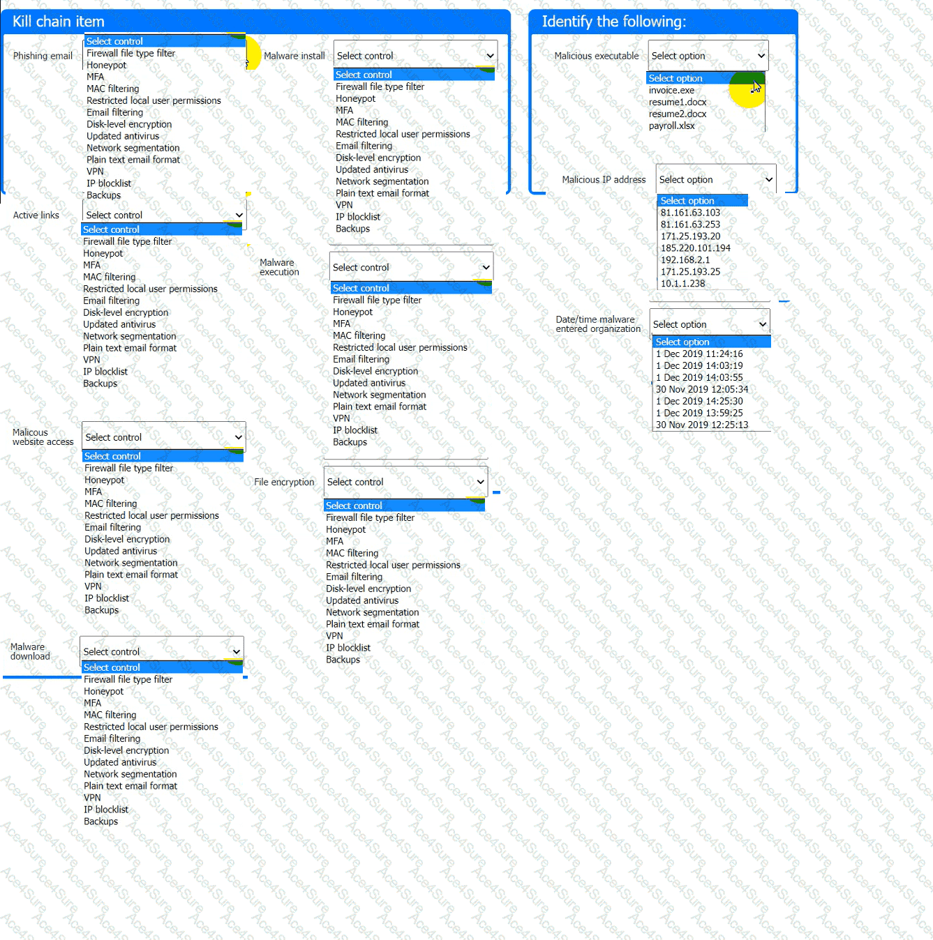 Review the kill chain items and select an appropriate control for each that would improve the security posture of the organization and would have helped to prevent this incident from occurring. Each