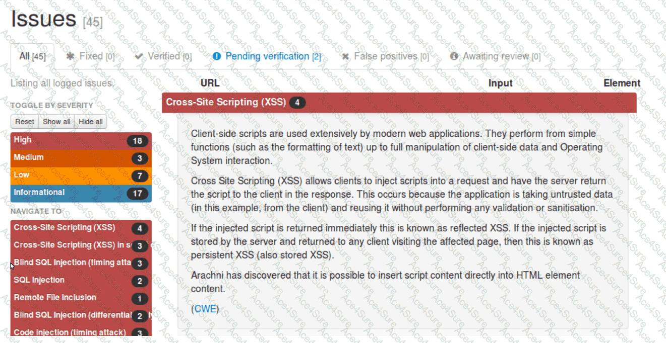 A security analyst reviews the following Arachni scan results for a web application that stores PII data: