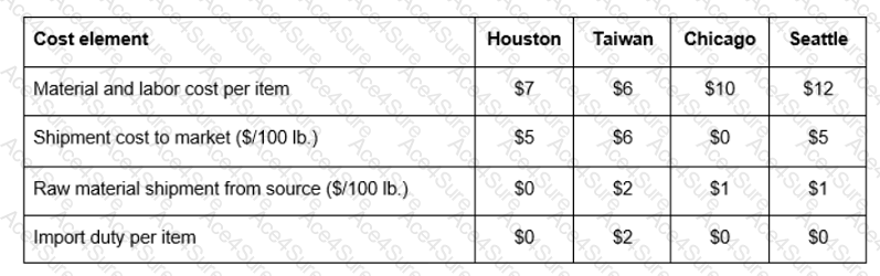 A company is determining where it should manufacture a product weighing 1 lb. for the Chicago market with a demand of 100,000 items per year. Costs for each of four possible locations are summarized in the table below. If the company wants to minimize the total cost to supply the items to the Chicago market, where should the items be produced?