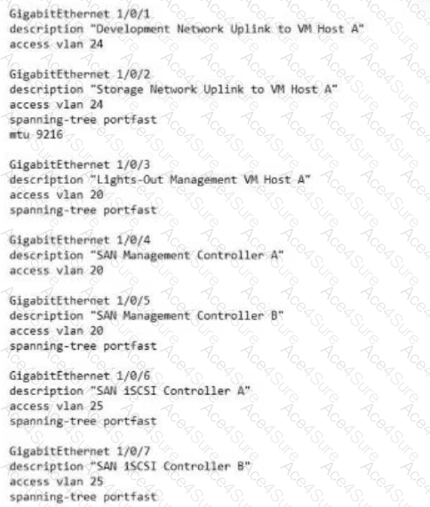 A systems engineer tries to mount an iSCSI LUN to a VM host in a data center, but the host does not discover any iSCSI targets. A sample of the switch configuration is shown in the following image: