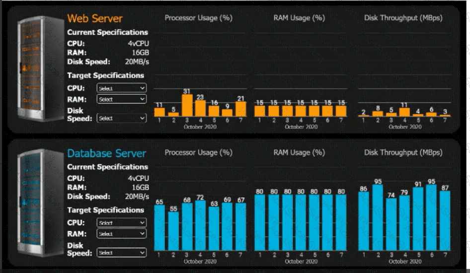 Review the specifications and graphs showing resource usage for the web and database servers. Determine the average resource usage and select the correct specifications from the available drop-down options.