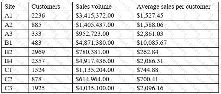 A data analyst is designing a dashboard that will provide a story of sales and determine which site is providing the highest sales volume per customer. The analyst must choose an appropriate chart to include in the dashboard. The following data is available: