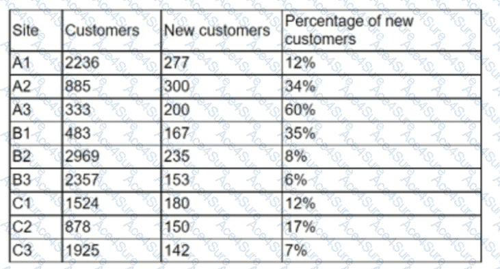 A bar chart is a good choice for comparing categorical data with numerical data, such as the site and the percentage of new customers. A bar chart can show the relative differences between the sites and highlight the site with the highest percentage of new customers. A bar chart can also be easily labeled and formatted to make the data clear and understandable.