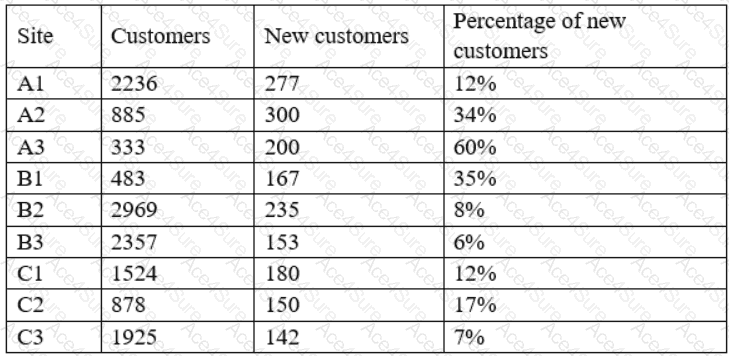 A scatter chart is a type of chart that shows the relationship between two variables for each observation or unit in a data set, such as the percentage of new customers and another variable for each site in this case. A scatter chart can be used to display and analyze the correlation, trend, or pattern among the variables, as well as identify any outliers or clusters in the data. For example, a scatter chart can show if there is a positive, negative, or no correlation between the percentage of new customers and another variable, such as salesrevenue or customer satisfaction.