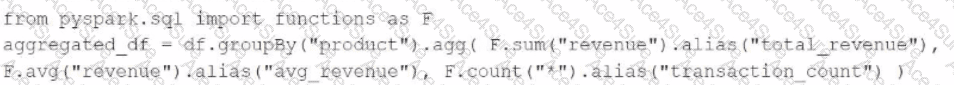 A data engineer has been provided a PySpark DataFrame named df with columns product and revenue. The data engineer needs to compute complex aggregations to determine each product's total revenue, average revenue, and transaction count.
