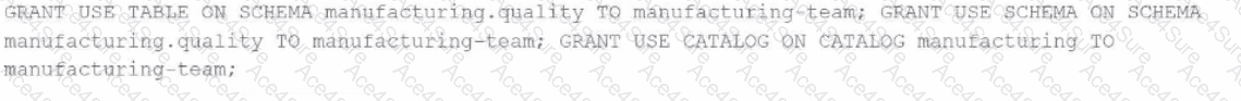 A data engineer needs to provide access to a group named manufacturing-team. The team needs privileges to create tables in the quality schema.