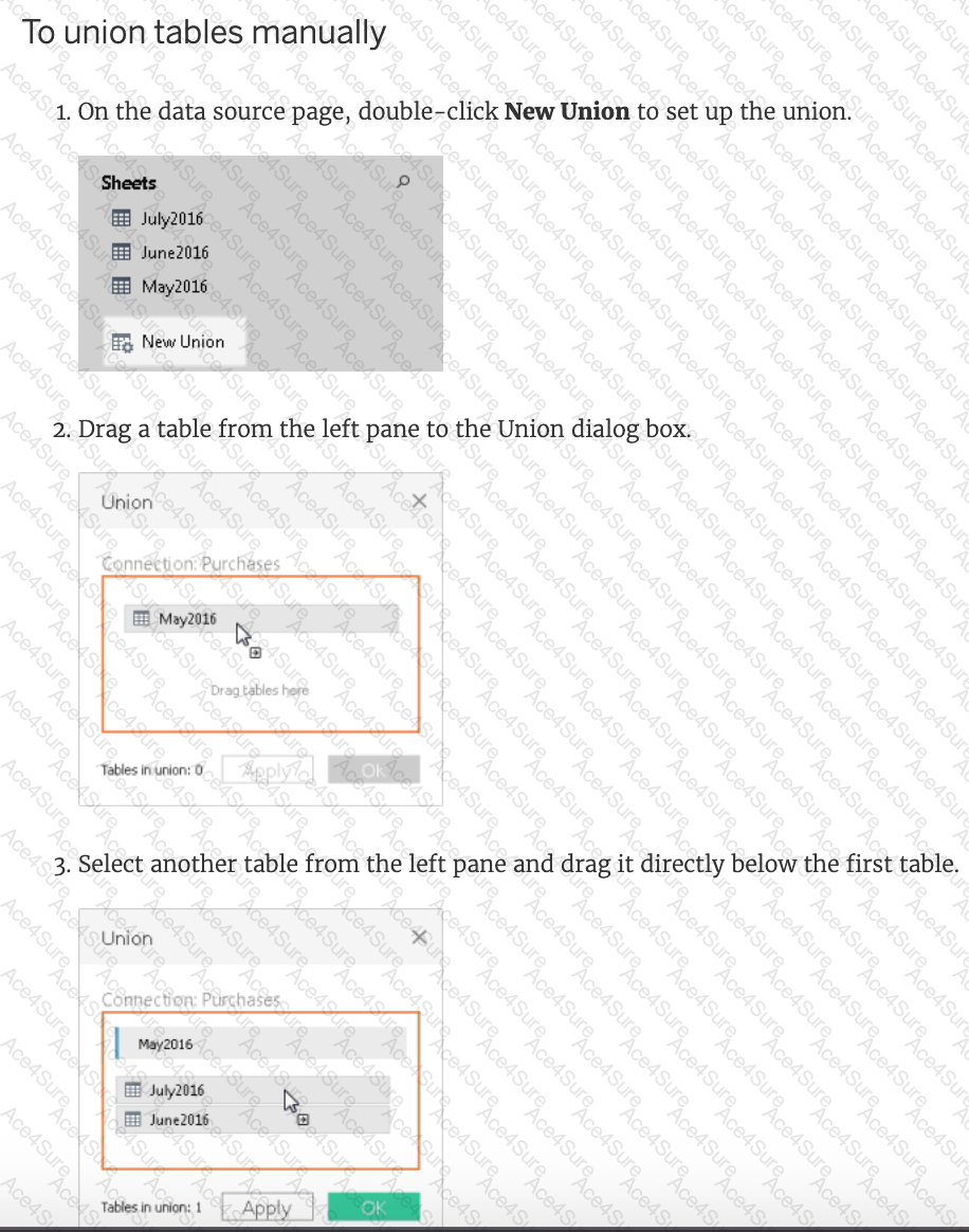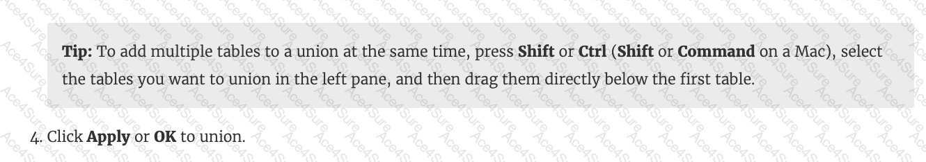 You can union your data to combine two or more tables by appending values (ROWS) from one table to another. To union your data in Tableau data source, the tables must come from the same connection.