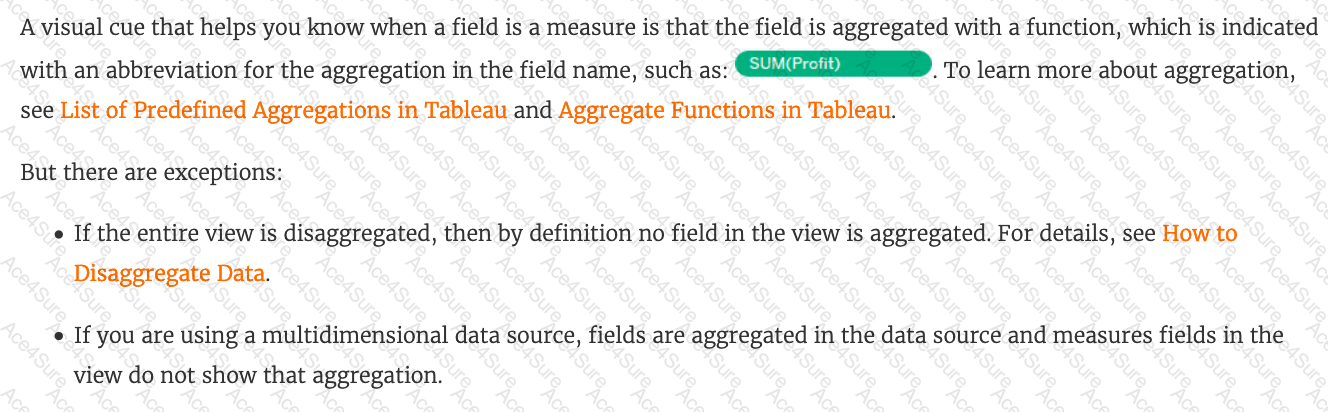 When you connect to a new data source, Tableau assigns each field in the data source as dimension or measure in the Data pane, depending on the type of data the field contains. You use these fields to build views of your data.