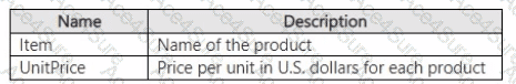 You have a Fabric warehouse named Warehouse1 that contains a table named dbo.Product. dbo.Product contains the following columns.