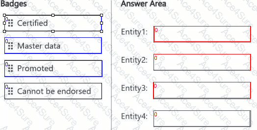 Which badge should you apply to each entity? To answer, drag the appropriate badges the correct entities. Each badge may be used once, more than once, or not at all. You may need to drag the split bar between panes or scroll to view content.