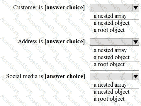 Use the drop-down menus to select the answer choice that completes each statement based on the information presented in the JSON document.