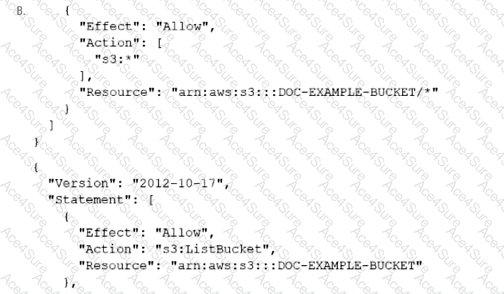 A company has an online web application that includes a product catalog. The catalog is stored in an Amazon S3 bucket that is named DOC-EXAMPLE-BUCKET. The application must be able to list the objects in the S3 bucket and must be able to download objects through an 1AM policy.