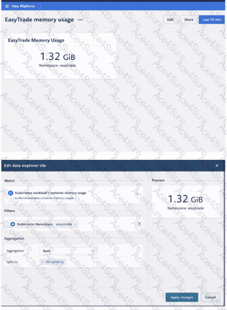 An application team needs to know how much memory their application, EasyTrade, is taking up in their Kubernetes cluster. They have to see the memory usage for all the pods running in the "easytrade' namespace, summed up into a single metric. Use a Dashboard in the new Platform interface (not Dashboards Classic) to show this information to the team and set the timeframe for this data to look at the last 30 minutes. Call this dashboard "EasyTrade memory usage".