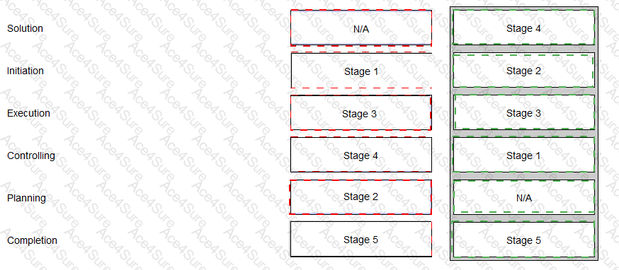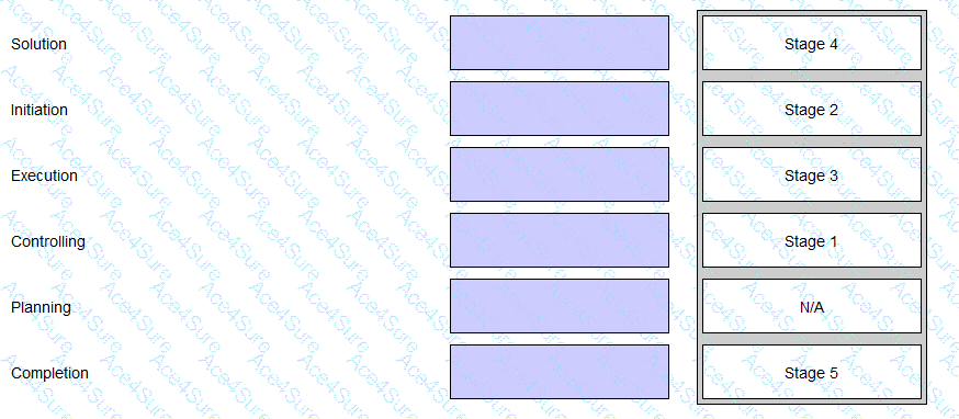 The Project Management Institute's 5 project management process areas identifies that five stages apply in project management. Place the relevant stage against the appropriate description.