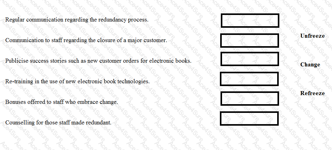 DDD is a company which publishes paper-based books. In the last 10 years DDD has seen a steady decline in its sales. Last month, one of its major customers, a large chain of high street bookshops announced that it would be closing as a result in declining sales in the paper-based book market. The Board of DDD has therefore announced that in order to survive, it must re-focus the business upon the developement of electronic books, which will require a significant investment in new technology and staff training. However, some staff will be made redundant as part of this process. The Board of DDD has stated that it will reward staff who actively embrace the change process.