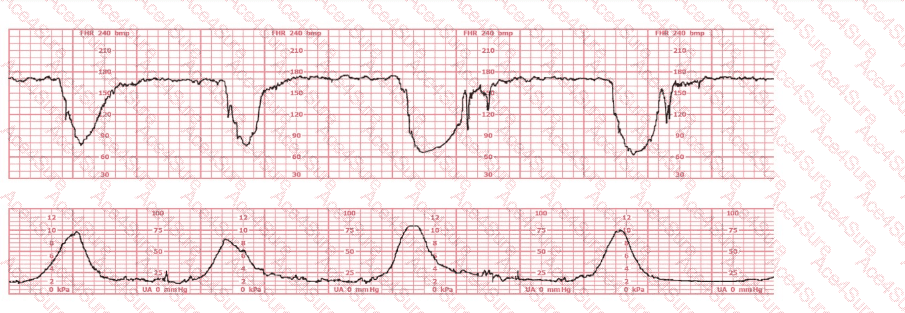 The fetal heart rate tracing demonstrates recurrent deep variable decelerations with a rapid drop in FHR, a V-shaped pattern, and slow return to baseline. These are classic signs of cord compression. According to NCC, AWHONN, Miller, Menihan, and Simpson, recurrent variable decelerations require immediate intrauterine resuscitative interventions before any decision regarding operative birth.