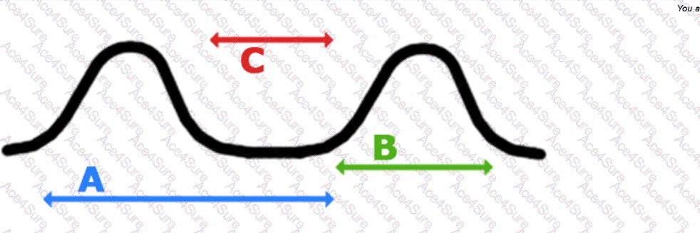 Red arrow (C) measures peak-to-peak amplitude shape, not duration.