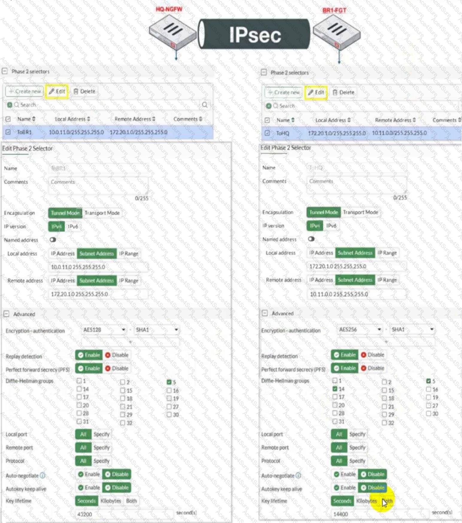 Based on the phase 2 configuration shown in the exhibit, which two configuration changes will bring phase 2 up? (Choose two.)