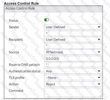An administrator wants to configure an access receive rule to matchauthentication status on FML-1 for all outbound email from the example. co- domain.