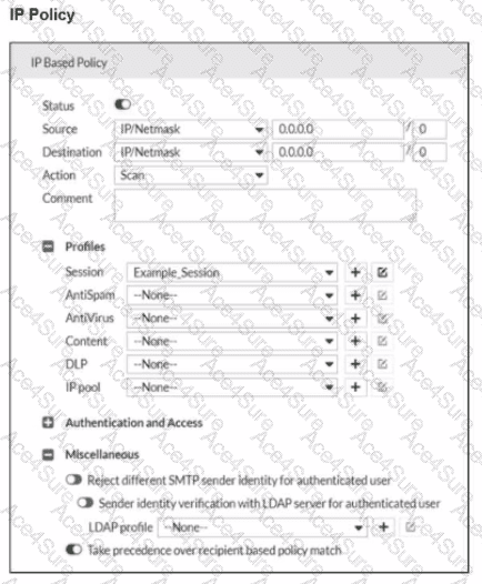 Refer to the exhibits, which show a topology diagram (Topology) and a configuration element (IP Policy).