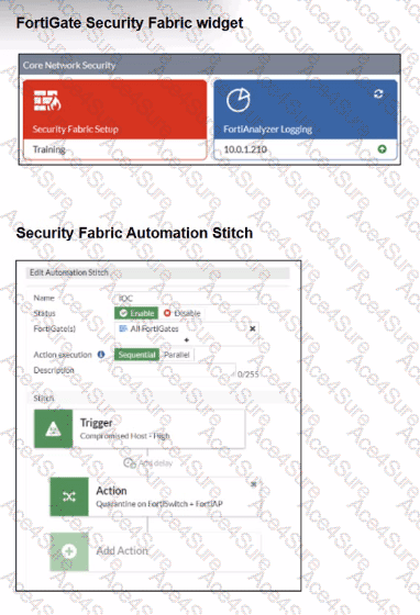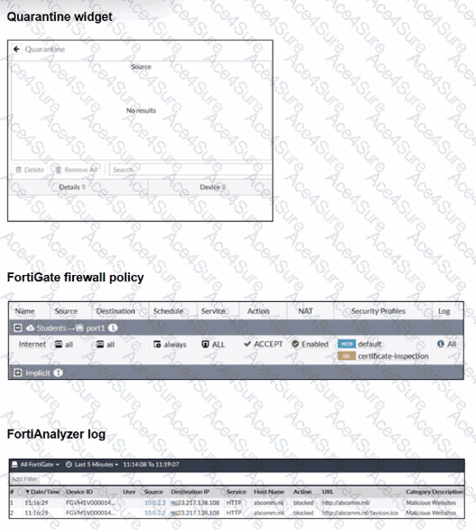 Examine the FortiGate configuration, FortiAnalyzer logs, and FortiGate widget shown in the exhibits.
