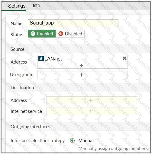 You configure SD-WAN on a standalone FortiGate device. You want to create an SD-WAN rule that steers Facebook and Linkedin traffic through the less costly internet link. The FortiGate GUI page appears as shown in the exhibit.