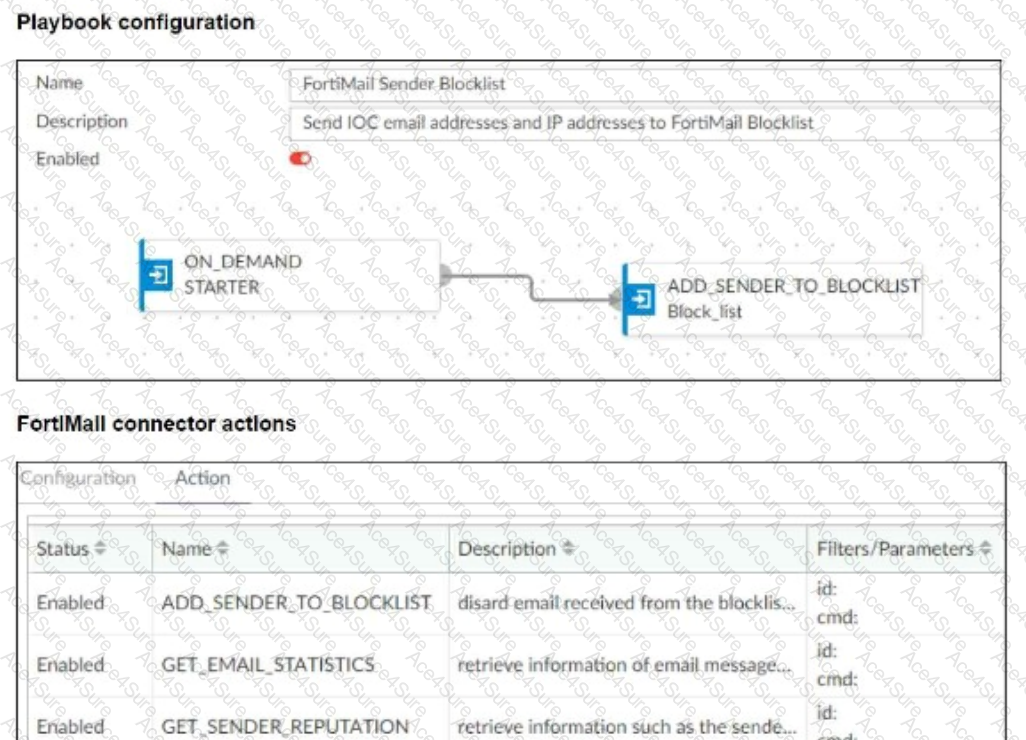 The FortiMail Sender Blocklist playbook is configured to take manual input and add those entries to the FortiMail abc. com domain-level block list. The playbook is configured to use a FortiMail connector and the ADD_SENDER_TO_BLOCKLIST action.