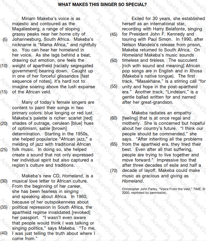 Makeba’s music is described as having a wider range of colors than just the two most singers use (lines 16–18). What does this statement reveal about her music?