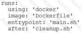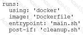 As a DevOps engineer, you are developing a container action. You need to execute a cleanup script after completing the main script execution. Which code block should be used to define the cleanup script?