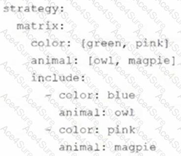 The matrix configuration specifies two variables: color and animal. The color variable has 2 values (green and pink), and the animal variable has 2 values (owl and magpie). This would result in 4 combinations (2 color values × 2 animal values). Additionally, the include section introduces two more combinations (color: blue and animal: owl; color: pink and animal: magpie).