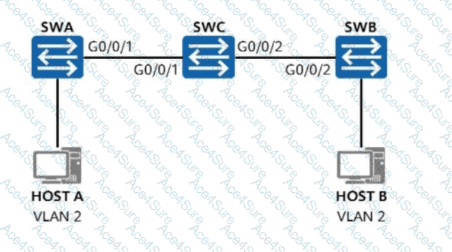 On the network shown in the figure, VLAN 2 is created on SWA and SWB, and interfaces connected to hosts are access ports added to VLAN 2. G0/0/1 on SWA and G0/0/2 on SWB are trunk interfaces allowing all VLANs. What additional configuration is needed on SWC to ensure communication between Host A and Host B?