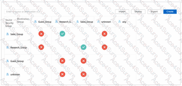 Theunknowngroup represents users that are not classified into Guest_Group, Research_Group, or Sales_Group. In the matrix, the unknown group is not completely blocked from all resources by default; access behavior depends on explicit policy configuration. Since the figure does not indicate a universal deny policy for unknown users toward all destinations,statement C is incorrect.