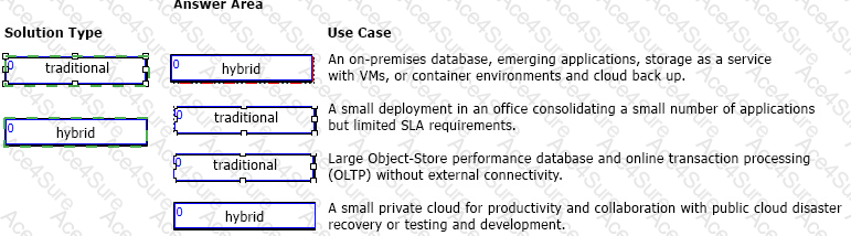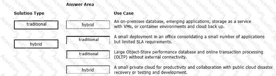 An on-premises database, emerging applications, storage as a service with VMs, or container environments and cloud back up. = Hybrid solution. This use case involves a combination of on-premises and cloud resources, and requires data and application portability between them.