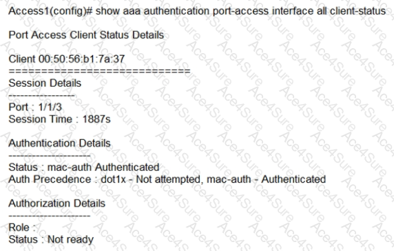 An AOS-CX switch is configured to implement downloadable user roles. Examine the AOS-CX switch output:
