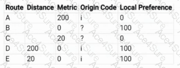 Hence, Route E is selected as the best path, and the “>” symbol is placed beside it in the BGP routing table.