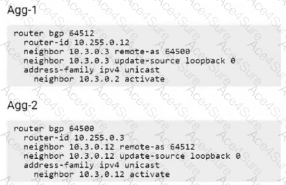A junior engineer has configured eBGP between two CX switches (Agg-1 and Agg-2) using the configuration below, and tells you that the neighbors are in the ‘Active’ state.