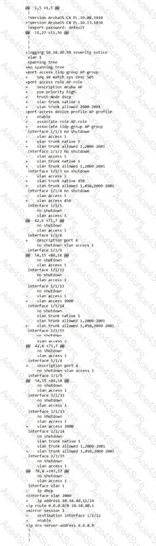 Analyzing the Exhibit: The output shows a comparison between a switch running version 10.08.1010 (the - line) and version 10.13.1030 (the + line), along with several configuration changes like adding an lldp-group, a port-access role, and IP addressing on vlan 2000.