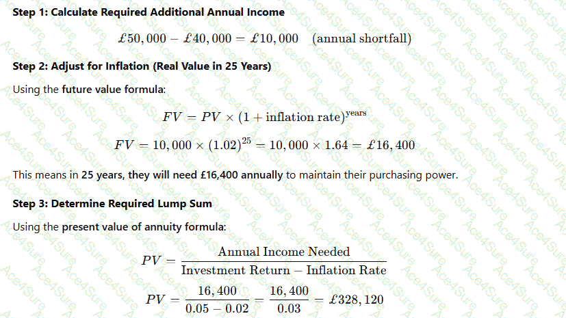 Your client estimates that they will require £50,000 of income annually to live off when they retire. Personal plus state pension will provide £40,000. They wish to retire in 25 years’ time. It is estimated that they can earn 5% per annum, and inflation has been forecast at 2%. Interest rates are currently 1.5%. Allowing for inflation, what lump sum would they need to accrue to supplement their pension?