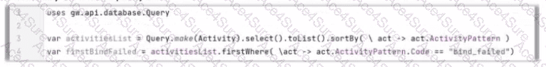 A developer wrote the following query to create a list of activities sorted by activity pattern, and then returns the first activity for a failed policy bind: