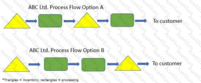 A firm has created the following process flow diagrams depicting two possible strategies for the production of a new product line. The triangles represent inventory, and the rectangles represent processing. Each of the two options start with the same raw materials, and both create the product through two stages of processing.