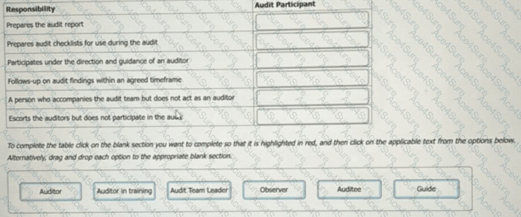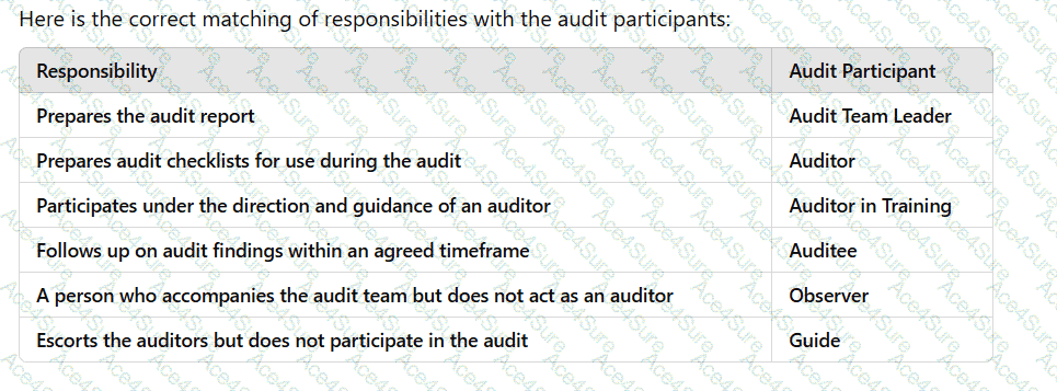 Escorts the auditors but does not participate in the audit → Guide:A guide facilitates the audit by helping auditors navigate the site and access relevant areas or documents.