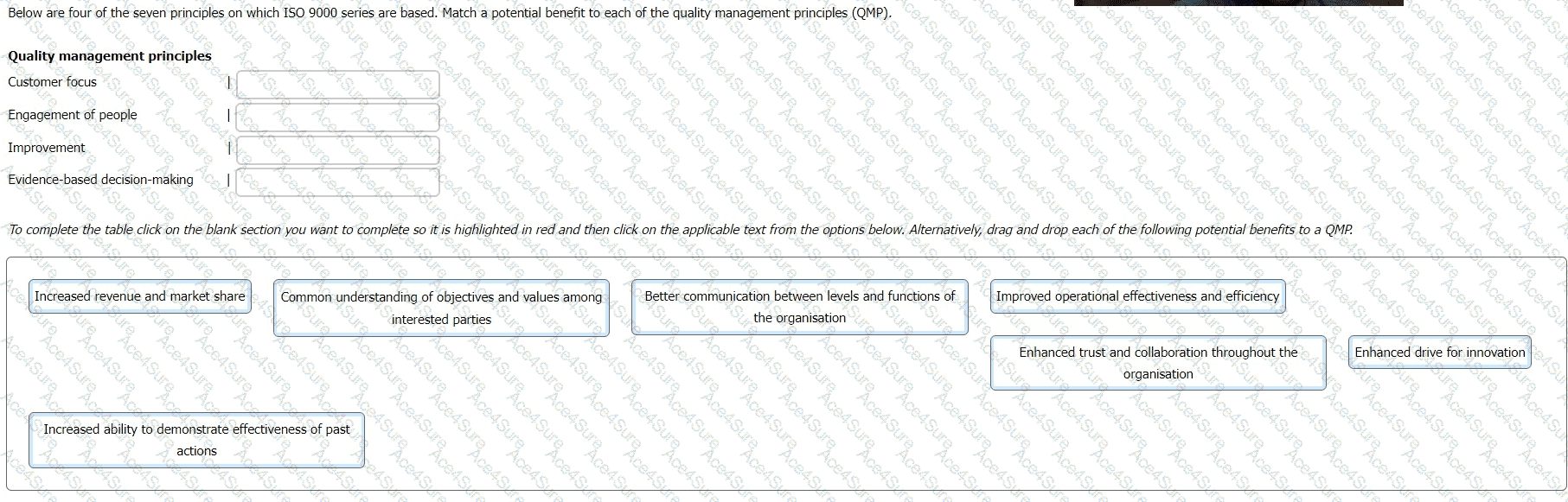 According to the Quality management principles document published by ISO, each quality management principle has a statement, a rationale, key benefits, and actions you can take to apply it. Based on these descriptions, the potential benefits can be matched to the corresponding principles as follows: