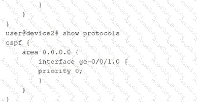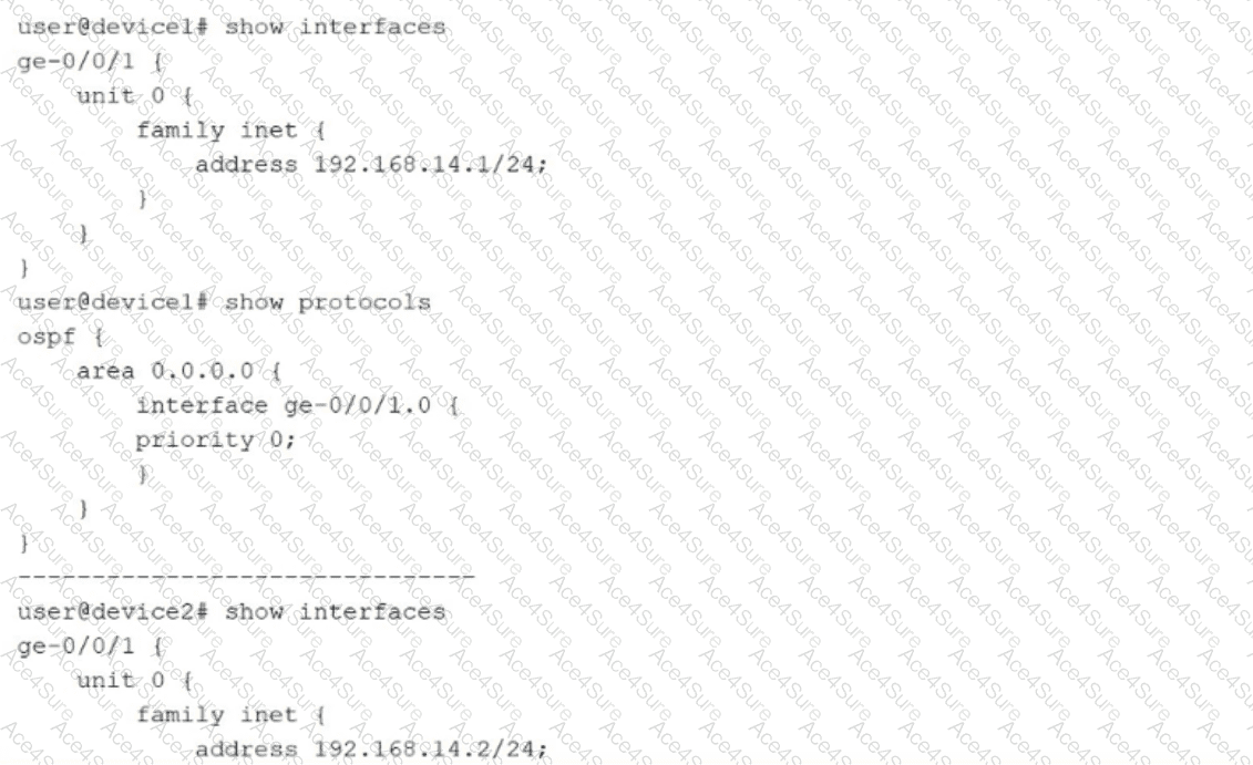 The exhibit shows that both device1 and device2 have their OSPF interface priority explicitly set to 0. According to the Junos OS 24.4 OSPF implementation: