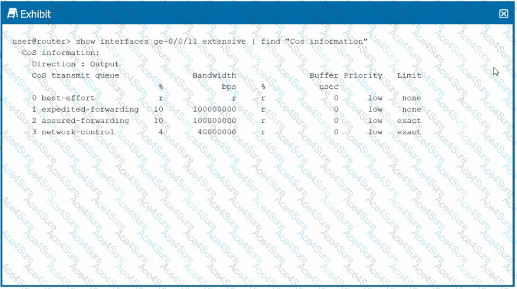 "Limit: exact" Behavior (Option B): The exhibit shows that Queue 2 (assured-forwarding) has a Limit set to exact.