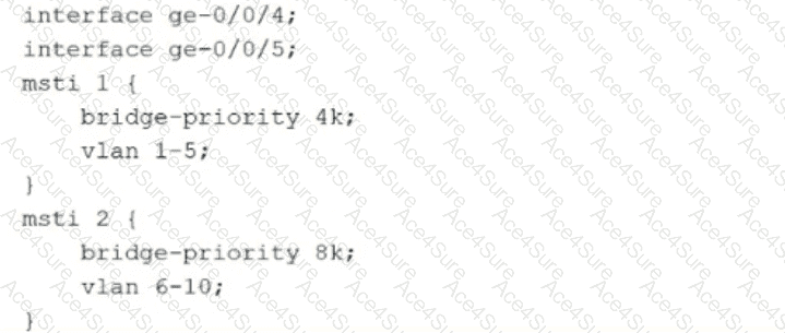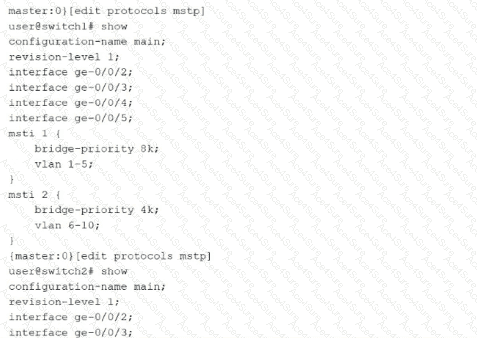 The exhibit shows the MSTP configuration for two switches, switch1 and switch2. MSTP allows you to group multiple VLANs into a single Multiple Spanning Tree Instance (MSTI), enabling different root bridges and topologies for different sets of VLANs.