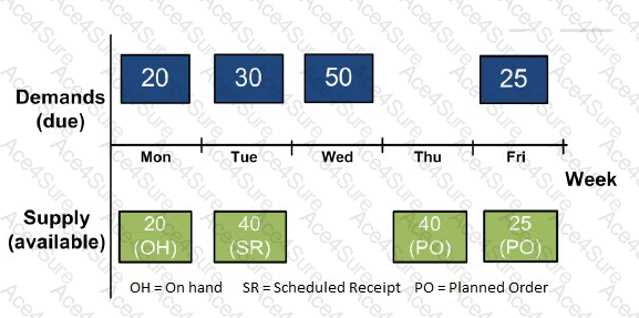 A part has several demands due in a particular week. All demands are the same priority. Available supplies are shown in the graphic. The control table settings for the OrderPriority.AllocationRule is FairShare and PlanningCalendars.AllocationCalendar is Week.
