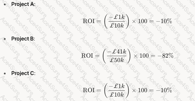 Project C: -10% ROIAll projects show a negative ROI, meaning none generate a profit over the investment cost. However, Projects A and C have the least negative ROI at -10%, while Project B is significantly worse at -82%. Between A and C, the ROI is identical, but both require the same investment (£10k) and yield the same returns. Therefore, there is no financial difference between A and C based on ROI alone. However, since the question asks for a choice, John should choose eitherProject A or Project Cover Project B, as they minimize losses. Without additional qualitative factors (e.g., strategic fit, risk), either A or C is equally viable. For simplicity, let’s recommendProject A.