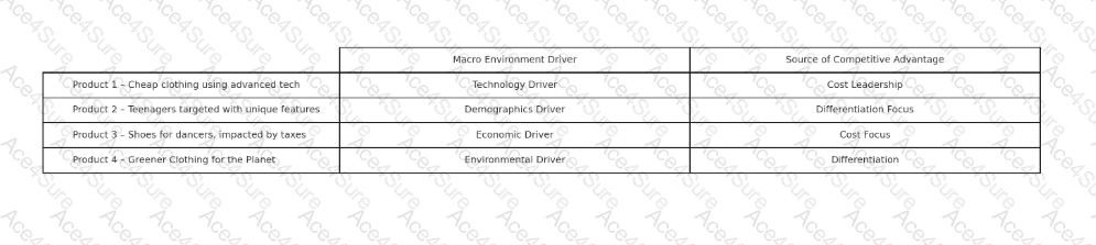 For each product, match the correct Macro Environment Driver and the correct Source of Competitive Advantage.