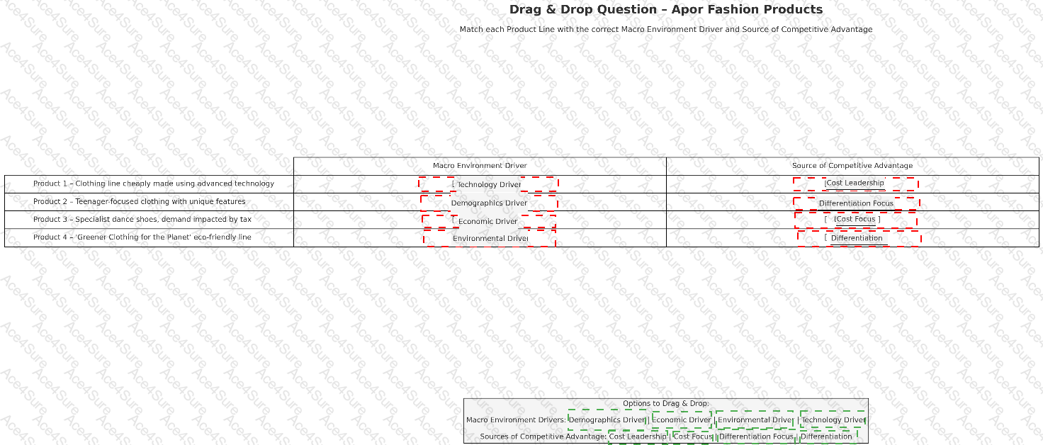 Product 3: This product is a specialist type of shoe only purchased by professional dancers. Apor’s strategy is to appeal to this small and specific customer segment, and it achieves advantage through low cost of manufacture. However, demand has been affected recently due to import duty and tax changes.
