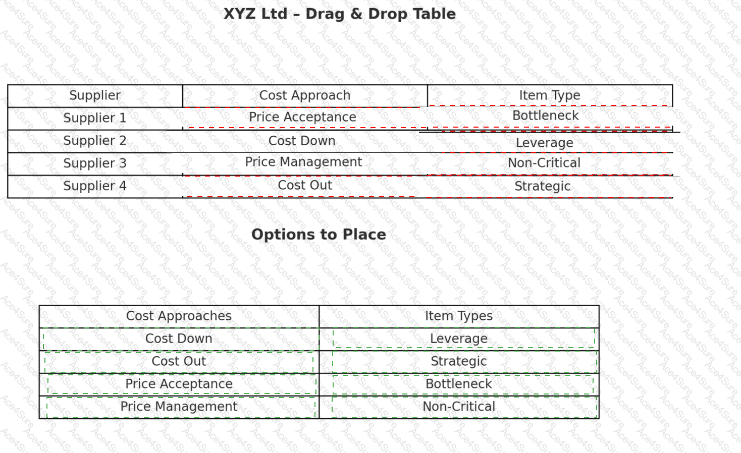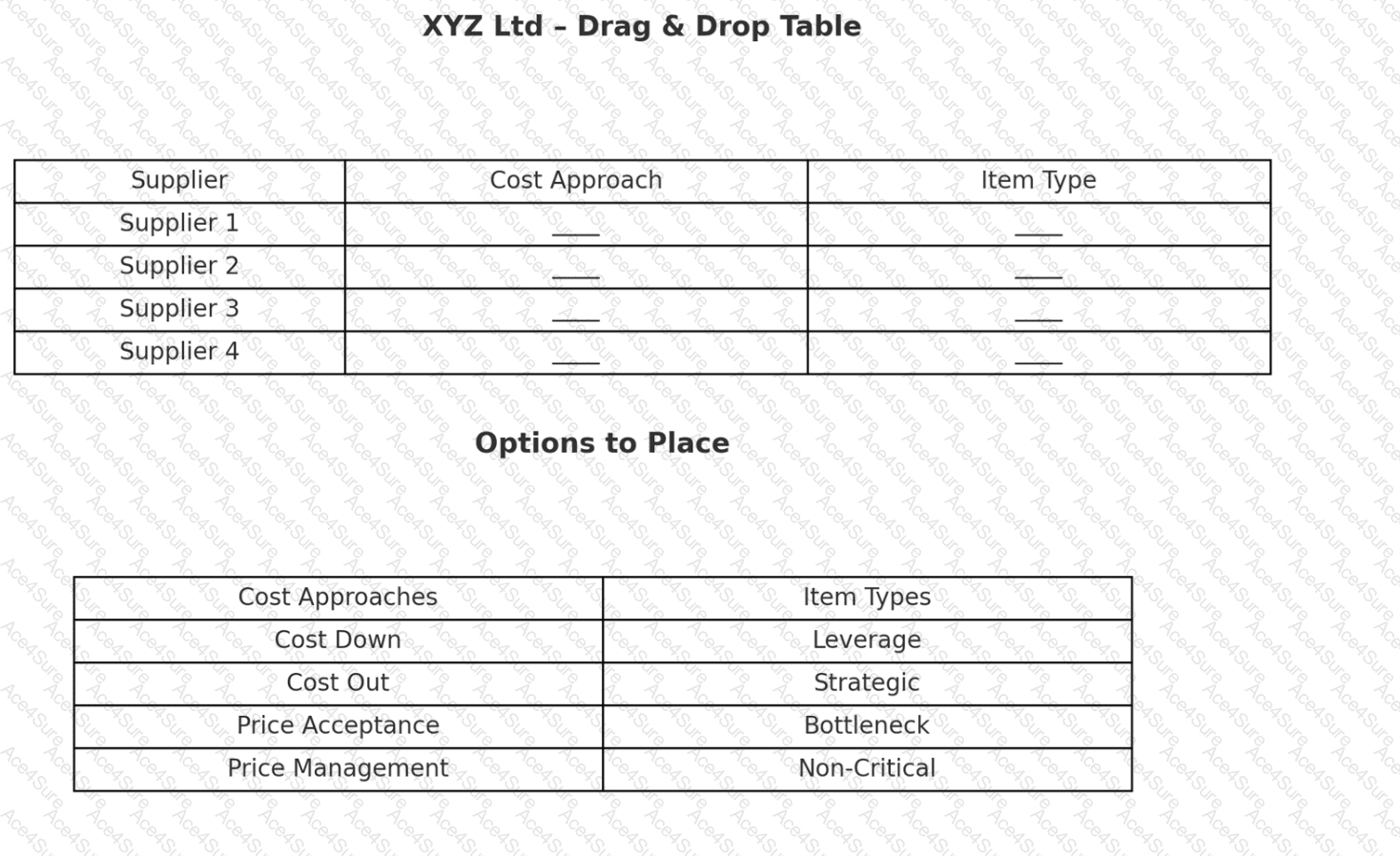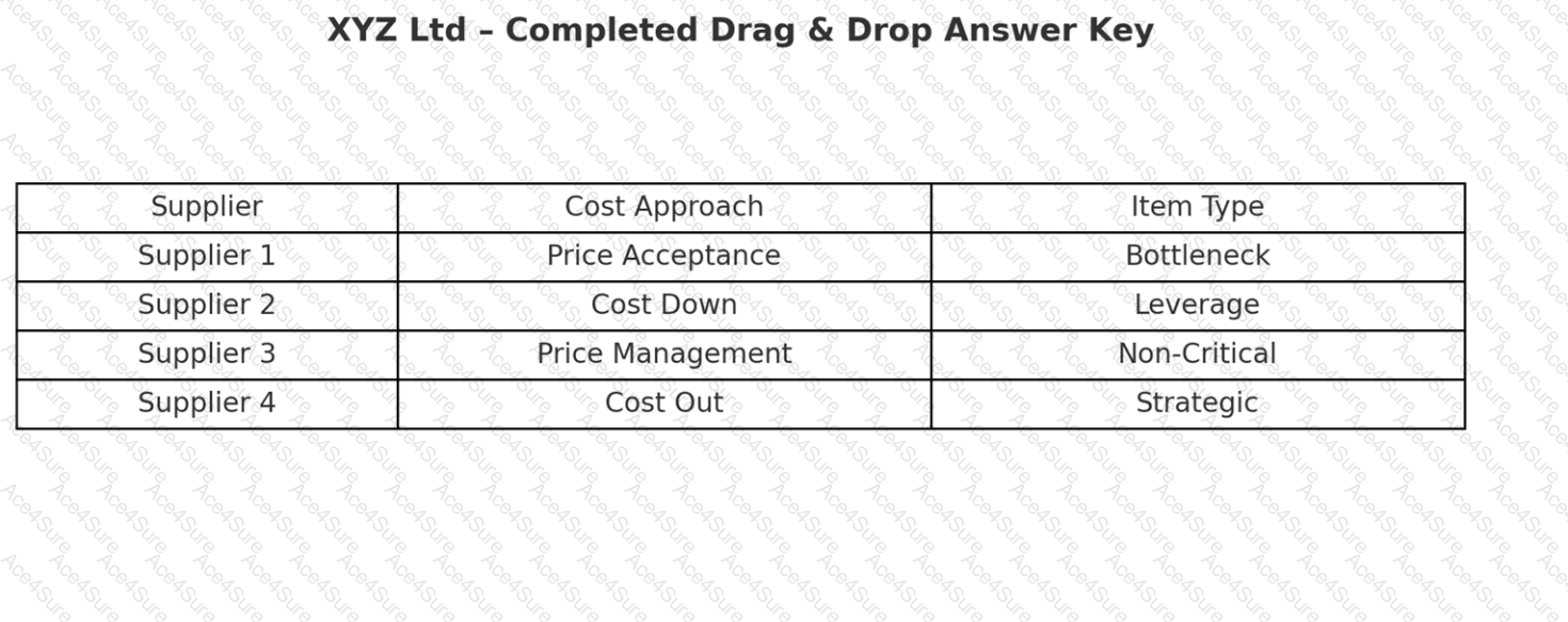 Supplier 2 provides items that, while not purchased in large volumes, have a high impact on profit and carry a low supply risk. These characteristics fit into the Leverage quadrant of the Kraljic Matrix: high profit impact, low risk. In such cases, buyers hold strong bargaining power and can use competition or collaborative cost reduction measures to secure better value. The chosen cost approach here is Cost Down, which involves working with suppliers to systematically reduce costs without reducing value. XYZ’s long-term relationship with Supplier 2, combined with a focus on identifying where costs could be lowered, matches the cost-down philosophy. Examples might include value engineering, supplier process improvements, or volume consolidation. Leverage items are ideal for competitive sourcing, e-auctions, and bulk negotiation. By applying a cost-down approach, XYZ can ensure sustained profitability while keeping supply risk under control.